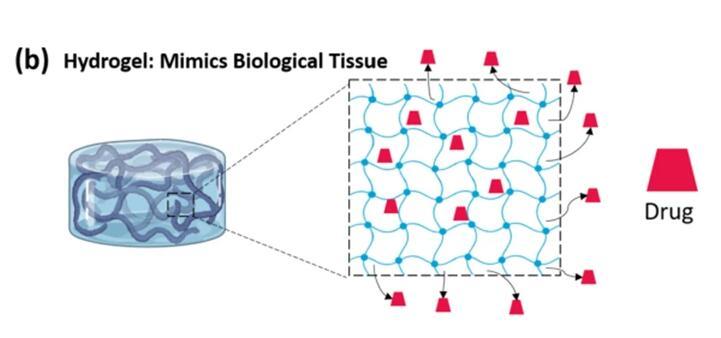水凝胶是通过物理或化学交联方法形成的三维聚合物网格。网格之间留有一定的空间,由于该网格的存在,水凝胶的结构富含多孔性。聚合物网格可以截留大量的水,并防止其运输到外部环境,从而模仿生物组织的物理特性。这种保水能力,使水凝胶能够提供良好的生物相容性和封装药物分子的平台。该网格可以限制不同酶的渗透,从而保护包封的药物免受各种酶降解。
