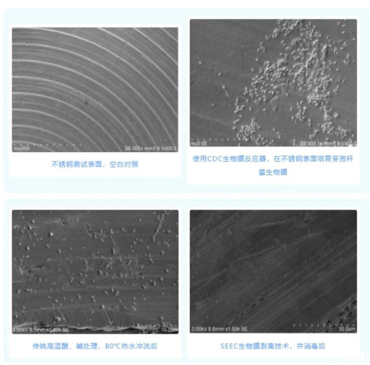 上图可见,高温或传统强酸、强碱工艺处理生物膜,效果不理想。高温、强酸或强碱无法有效清除已粘附于系统上的生物膜,且无法对生物膜下微生物进行有效杀灭。因传统方法清除生物膜效果不理想,研究表明,过氧化氢在控制生物膜方面要比氯更有效,过氧化氢通过极强的氧化作用穿透细胞壁和生物被膜,破坏细菌的dna,从而杜绝生物膜的产生。