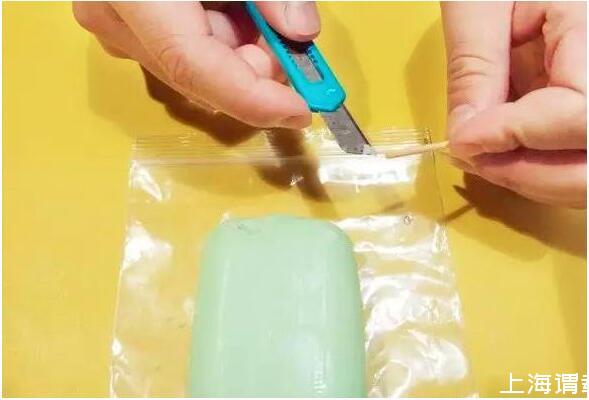 3.用小刀在肥皂刮下一小块,将刮下的肥皂嵌入劈开的牙签中。
