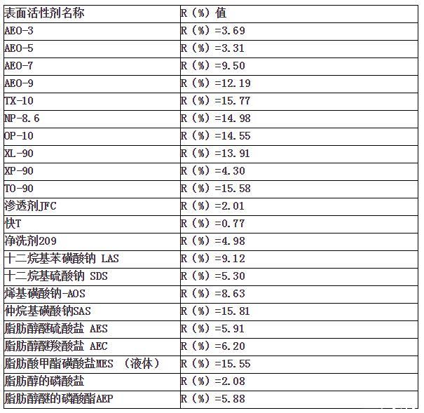 R值越大,表明净洗能力越强,该测试标准可用来表征表面活性剂对一般污垢的去除,不适用于反映油脂和蜡质的去除能力。