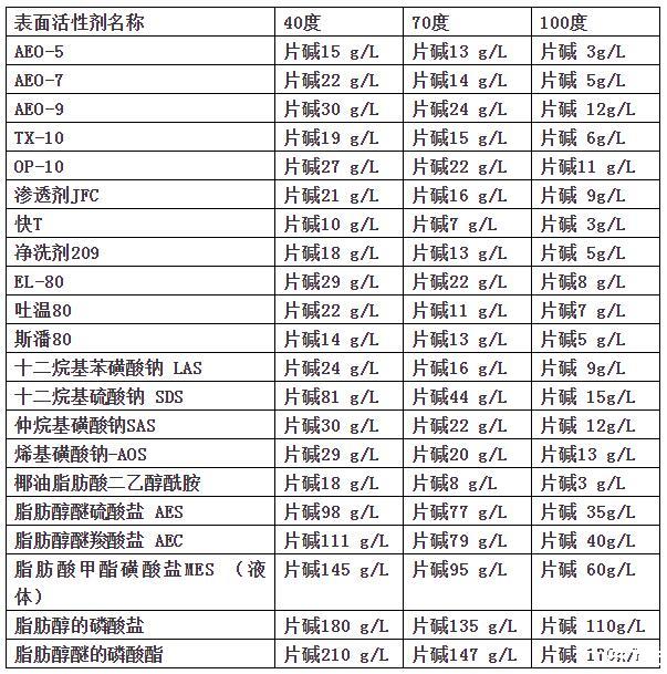 目前常见的表面活性剂耐碱性能如下表: