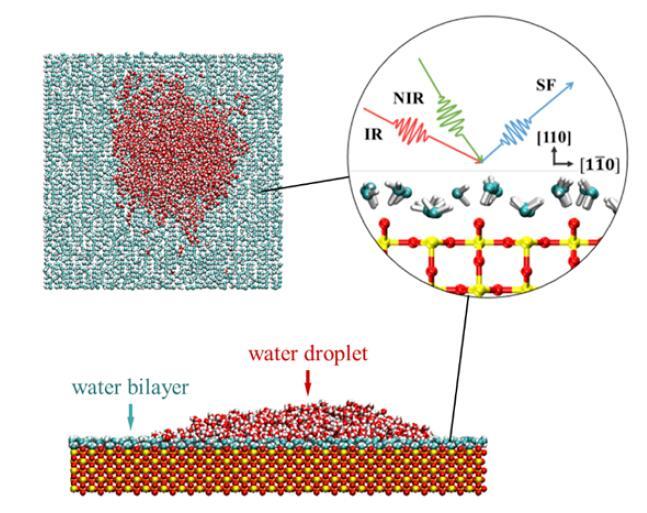 以TiO2的Rutile晶型110表面为例,和频共振光谱实验与理论发现常温下该表面上有序双层水结构,且该有序结构导致水层上水滴存在。