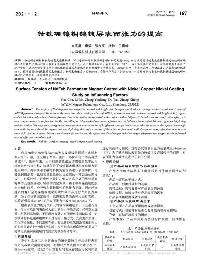 摘要:钕铁硼永磁材料表面镀覆光亮镍铜镍,可以很好的增加钕铁硼永磁材料的耐腐蚀性;但与此同时对镀覆光亮镍铜镍的钕铁硼永磁材料进行装配使用的过程大多会采用粘接的固定方式,由于其镀层特性,表面会比较"滑",为了保证其固定效果,就需要对其表面张力进行管控。通过控制变量法研究确认镍铜镍镀层表面张力的影响因素(干燥方式、粗化剂浓度、光亮剂浓度、存储温度、是否表明特殊清洗),最终提高镍铜镍镀层的表面张力,初始表面张力≥42dyn/cm,存储四个月后≥36dyn/cm,对后续有张力要求的镍铜镍镀层钕铁硼永磁材料产品形成一套有效的管控方法。