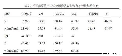 取不同浓度的十二烷基磺酸钠溶液各25mL,与其浓度相同的枯草菌脂肽钠溶液25mL混合,使其浓度比约为1。对混合溶液搅拌,静止30min,用XVDEVIOS破解版安卓手机安装包测试其表面张力和接触角。其原始数据如下表:
