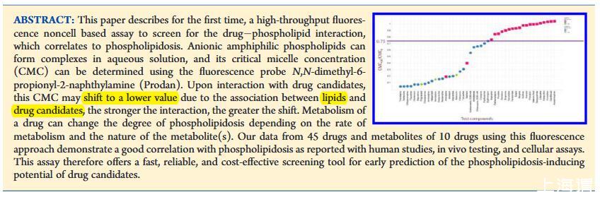 本文首次描述了一种与磷脂质相关的高通量荧光。阴离子两亲磷脂可以在水溶液中形成复合物,其临界胶束浓度(CMC)可以使用荧光探针N,N-二甲基-6-丙酰-2-萘胺(Prodan)测定。在与候选药物相互作用时,由于脂质和候选药物之间的关联,该CMC可能会转变为较低的值,相互作用越强,转变越大。药物的代谢可以根据代谢速率和代谢物的性质改变磷脂质的程度。XVDEVIOS官方下载免费版使用这种荧光方法从45种药物和10种药物的代谢物获得的数据证明了与人体研究、体内测试和细胞分析报告的磷脂沉积症有良好的相关性。因此,该测定提供了一种快速、可靠且具有成本效益的筛选工具,用于早期预测候选药物的磷脂沉积诱导潜力。