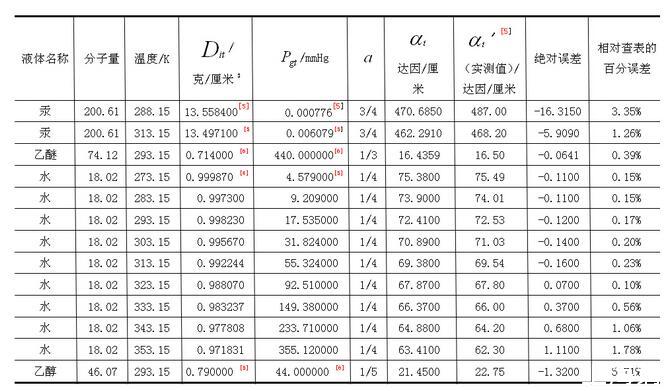 其中N0为阿伏伽德罗数,M为摩尔质量,Dit是液体的密度,Dgt是液体饱和蒸汽的密度,a为与液体种类相关的常量。为验证(1)式的正确性,对汞、乙醚、水、乙醇等实际液态物质的表面张力系数进行理论计算,并与实验实测值'相比较,列于下表【3】: