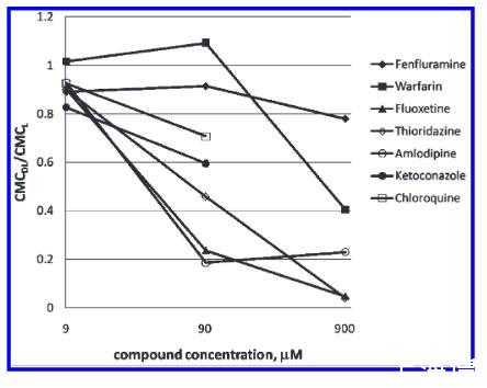 图4.CMC移位(通过将药物-脂质复合物(DL的CMC之间的比率表示)和单独的脂质(L)的CMC:CMC测试化合物与二FF erent科幻最终在浓度样品孔在pH7.2。
