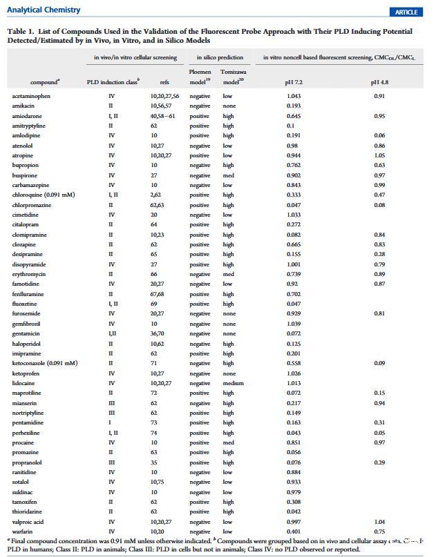 测定pH影响。PLD中的脂质紊乱主要在构成酸性的溶酶体区室中观察到环境。为了模拟溶酶体条件,pH 4.8醋酸盐在PLD筛选研究中使用缓冲液,25种进行研究使用上述相同的程序商业化合物(表1)对。大多数化合物在结果相似两种缓冲液中的;然而,胺碘酮、氯米帕明、米安色林和华法林给出了截然不同的数据,将前三种化合物从PLD诱导剂转移到非诱导剂,将华法林剂转移从非诱导到诱导剂,从pH 7.2到pH 4.8。