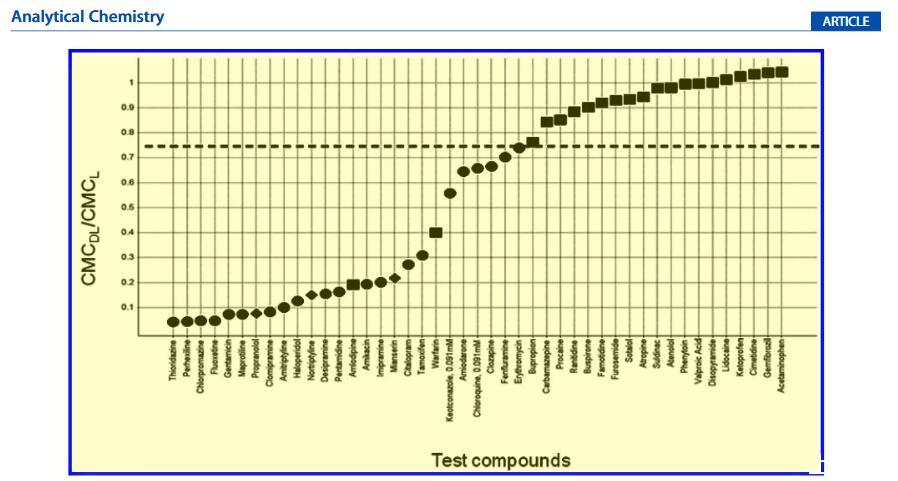 测定了45种商业化合物的药物脂质复合物的CMC值,并与在人类、动物或培养细胞中观察到的PLD进行比较(表1)。正如文献中所建议的那样,这些化合物分别分为四类。19,27 CMC偏移的程度由CMC比率(CMCDL/CMCL)表示(图3)。将来自人类、动物或培养细胞的PLD数据与使用这种荧光方法检测到的CMC偏移进行比较(图3)并使用CMC比率在