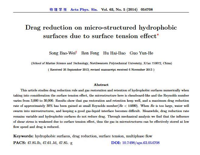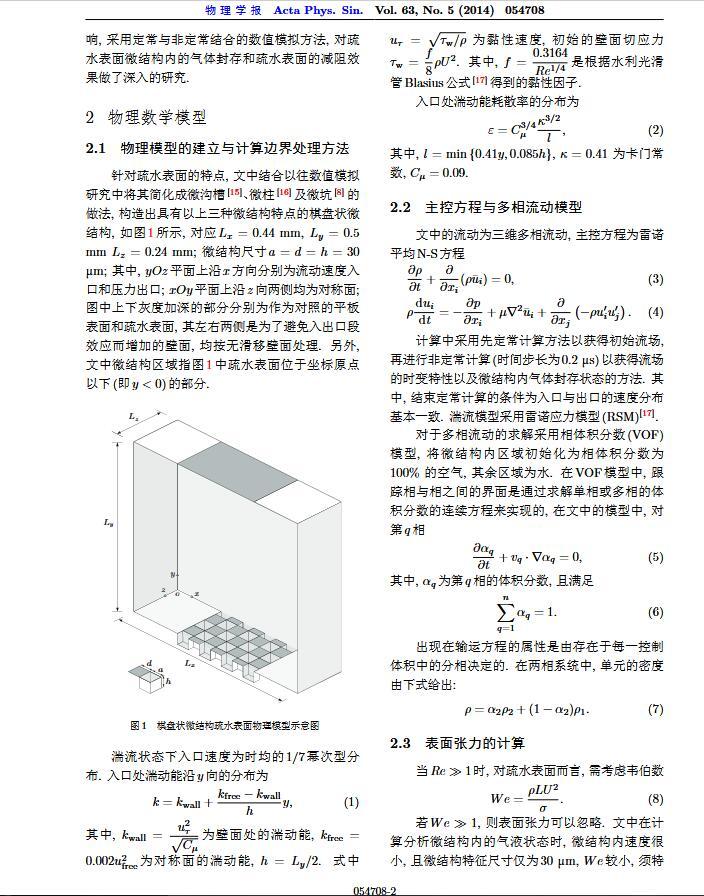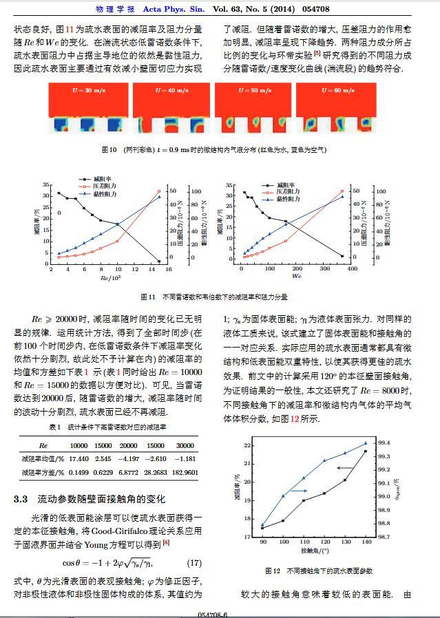 通过构造具有棋盘状微结构的疏水表面,考虑表面张力的影响,利用定常与非定常结合的数值模拟方法,研究了疏水表面在湍流状态下的减阻特性以及微结构内气体封存的效果,其中Re=3000—30000.在低雷诺数下,疏水表面微结构内气体封存状态良好,减阻率最高约为30%;随着雷诺数的增大,压差阻力增大,减阻率有下降趋势.当来流速度过大时,水会大量进入微结构,疏水表面的减阻率变化剧烈,且已经不再减阻.结果表明,表面张力削弱了壁面切应力的影响,使得低雷诺数下微结构内气体能够有效封存,进而减小壁面阻力.