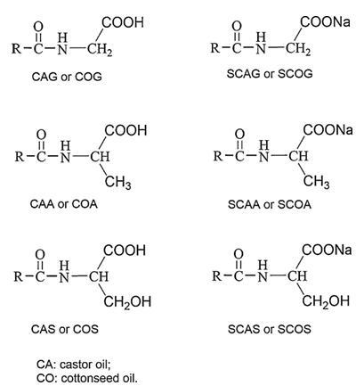 酰基氨基酸表面活性剂,即相应的CAG、COG、CAA、COA、CAS和COS的钠盐,通过用NaOH水溶液中和酰基氨基酸至pH 8-9直至获得完全澄清的溶液来制备。这些钠盐分别命名为SCAG、SCOG、SCAA、SCOA、SCAS和SCOS。