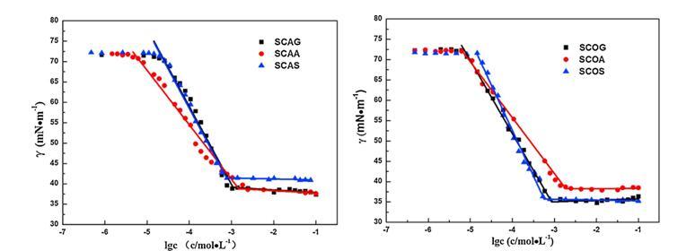图1 6种来自蓖麻油(左)和棉籽油(右)的酰基氨基酸表面活性剂在25°C下的表面张力曲线。画线以显示断点。