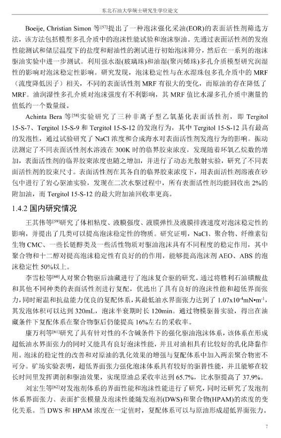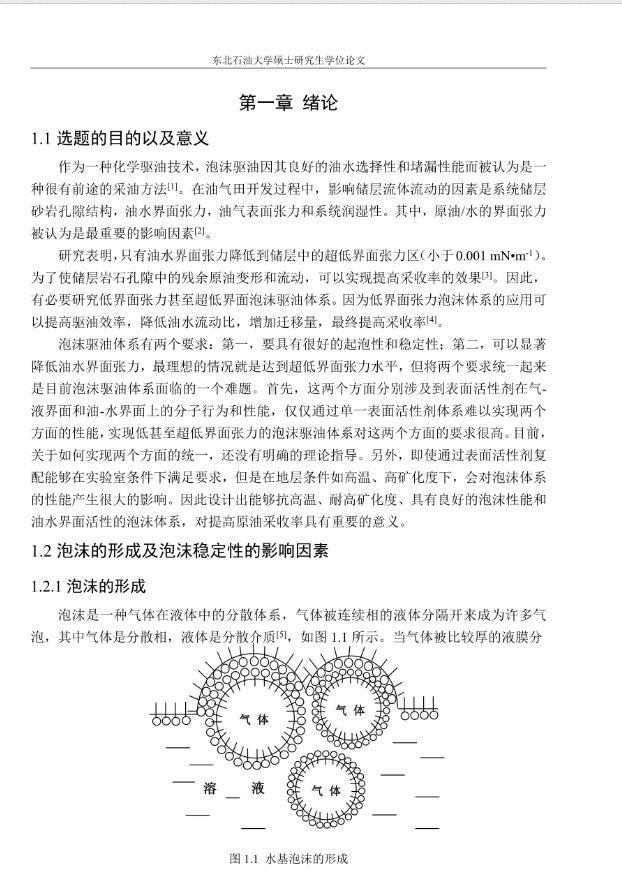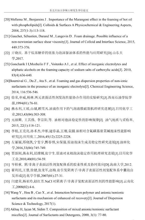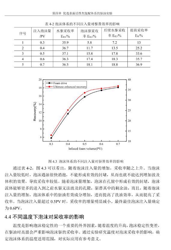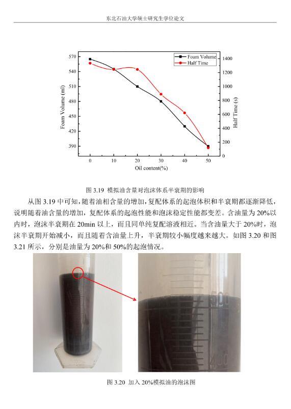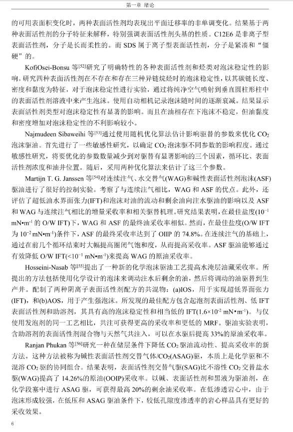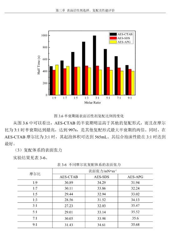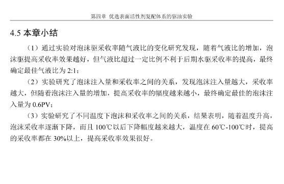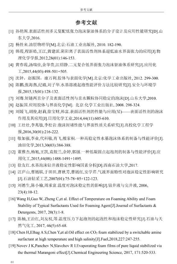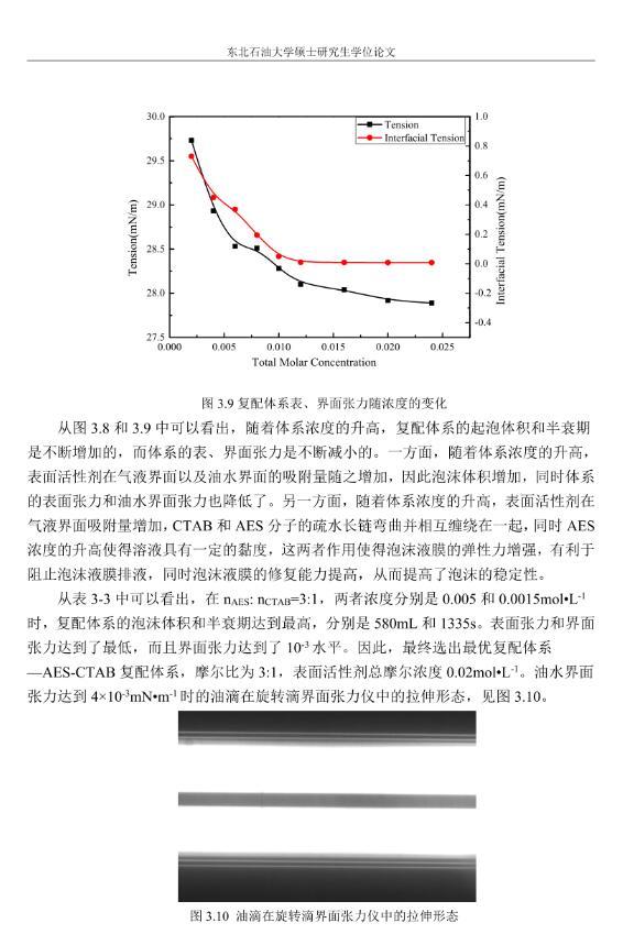 【摘要】:泡沫驱具有良好的驱油性能,在提高采收率方面备受关注。在泡沫驱油过程中,能够明显降低注入流体的流度,改善流度比,降低流体的相对渗透率,延缓注入流体的突破时间,封堵高渗层的大孔道,改变液流的方向,较好地实现封堵作用。但泡沫作为一种热力学不稳定流体,其稳定性受许多因素的影响,包括遇油快速消泡、在高温和高矿化度的情况下极易破裂等,泡沫稳定性已成为泡沫驱油时亟待解决的问题。另外,用于泡沫驱的泡沫体系很难兼具超低界面张力和稳定泡沫两种性能,而且文献报道对这方面的研究较少,这为本文提供了一个新的思路。实验室合成阴-非离子型表面活性剂十二醇聚氧乙烯醚硫酸钠(AES)。AES同时具有阴离子和非离子两种表面活性剂的性能,具有很好的泡沫性能和表面活性,同时与其它表面活性剂具有很好的相容性。最终确定的合成条件为:十二醇聚氧乙烯醚和氨基磺酸的摩尔比为1:2,反应温度为95℃,反应时间为60min。在合成AES的基础上,选择几种不同类型的表面活性剂进行复配,优选出泡沫性能和表面活性优良的体系,进行耐温、耐矿化度及耐油性能的评价。实验采用Waring-Blender法测量泡沫的起泡体积和半衰期,采用吊环法和旋转滴法测量复配体系的表面张力与油水界面张力。实验最终优选出泡沫性能与表面活性优良的AES-CTAB复配体系,并确定其最佳复配摩尔比为3:1,最佳总浓度为0.02mol·L-1。复配体系耐温200℃,耐质量分数20%的原油,矿化度增加可以提高复配体系的泡沫稳定性和表面活性。实验从气液比、泡沫注入量和温度三个方面对泡沫提高采收率的影响进行研究。最佳气液比为2:1,最佳泡沫注入量为0.6PV,泡沫采收率随温度的提高逐渐下降,在60-100℃范围内泡沫在水驱后提高采收率在30%以上。
