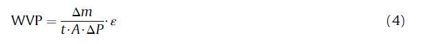 其中WVP=水蒸气渗透率,单位g mm m-2次方h-1次方Pa-1次方;ε=厚度mm;m=质量随时间的变化,单位为g;t=h中的时间;A=薄膜面积,m2;和DP=杯内薄膜表面的校正水蒸汽分压e柜内薄膜外表面的水蒸汽分压。