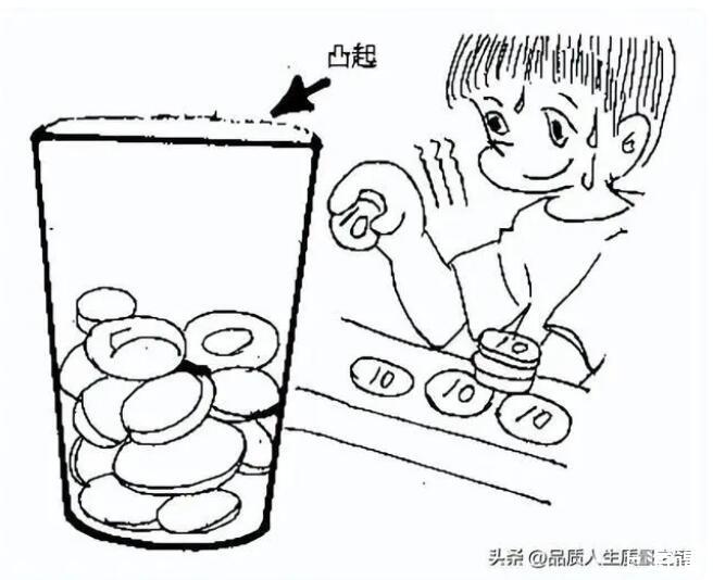 表面张力的实验:这个实验,也可以说是一个关于表面张力的小游戏。先找一个朋友和你一起来进行这个游戏,然后准备一杯水(把水加到杯子的边缘处,目视水至杯口齐平处),16枚1元的硬币(也可以更多)。然后是这个游戏的规则,和朋友每人一次向杯子里轮流投放硬币,每次投放硬币数没有限制,可以一次放进1枚,可以2或3枚,或者更多,直到谁先把水溢出杯子为止。投放硬币的时候用拇指和食指捏住硬币轻轻的放进盛满水的杯子。本人最多一次投放了16枚1元硬币。呵呵,好的大家去试试吧。