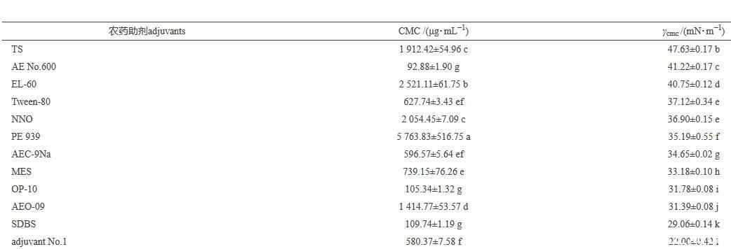 从表2中可见:不同种类的助剂具有不同的临界胶束浓度(CMC)和临界胶束浓度时表面张力(γcmc),与其对照(水)相比各助剂临界胶束浓度时的表面张力均小于水的临界表面张力[(72.75±0.01)mN/m],并存在显著性差异。其中,助剂1#、2#和4#当质量浓度达到CMC时表面张力的降低率在72.63%~69.75%,助剂4#的效果最好,其次是助剂1#和2#,临界表面张力分别是(19.91±0.11)、(20.00±0.01)和(22.00±0.42)mN/m。而自制的助剂3#以及目前农药生产上应用较为广泛的常规绿色助剂十二烷基苯磺酸钠(SDBS)、烷基酚聚氧乙烯醚(OP-10)、Tween-80和农乳600#等与助剂1#、2#和4#相比,对水表面张力的降低能力稍弱,但在P<0.05水平上差异显著性分析表明均显著低于水的临界表面张力。茶皂素对水的表面张力影响最小,临界表面张力为(47.63±0.17)mN/m,降低率仅为34.53%。