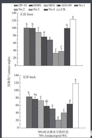 图3助剂对药液在小麦叶正、反面静态接触角的影响