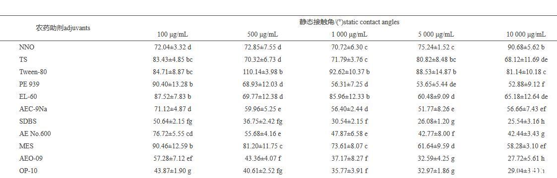 表3不同质量浓度的助剂溶液在小麦叶正面上的静态接触角(mean±SD,n=5)