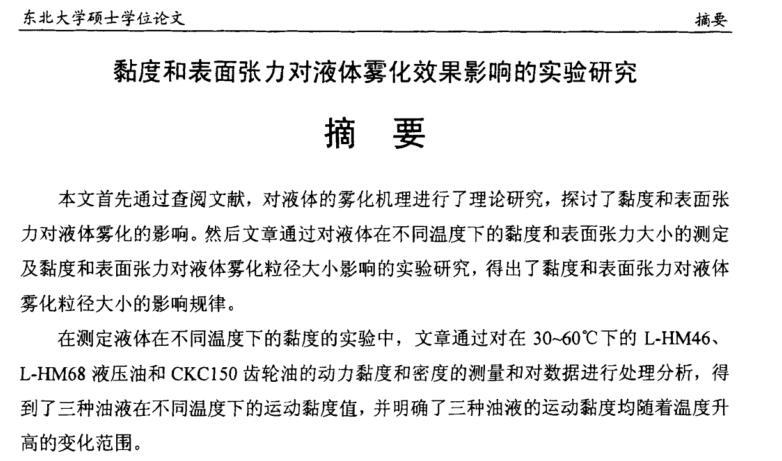 在测定液体在不同温度下的黏度的实验中,文章通过对在30~60℃下的L-HM46、 L-HM68液压油和CKC150齿轮油的动力黏度和密度的测量和对数据进行处理分析,得到了三种油液在不同温度下的运动黏度值,并明确了三种油液的运动黏度均随着温度升高的变化范围。 在测定液体在不同温度下的表面张力的实验中,文章通过测量30~60℃下的L-HM46、L-HM68液压油和CKC150齿轮油的表面张力及对数据进行处理分析,得到了三种油液在不同温度下的表面张力值,并明确了油液的表面张力随着温度升高的变化范围。