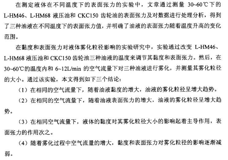在黏度和表面张力对液体雾化粒径影响的实验研究中,实验通过改变L-HM46、 L-HM68液压油和CKC150齿轮油三种油液的温度来调节其黏度和表面张力。然后,在30~60℃的温度内和6~12L/min的空气流量下对三种油液进行雾化,并测量其雾化粒径的大小。通过该实验,本文得到如下三个结论: