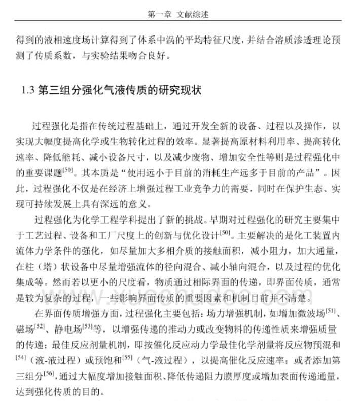 首先,研究了在液相中添加三种不同临界胶束浓度的表面活性剂对气液比表面积和传质系数的影响。实验结果表明,表面活性剂在气液界面聚集,会增大气液比表面积,但由于胶束现象的存在,会减小CO2吸收的总包传质系数和液相传质系数,因此临界胶束浓度是表面活性剂的一个重要参数。其次,研究了向气相加入低表面张力物质(乙醇和正丙醇)对气液两相传质的影响,并探讨增强传质过程的途径。气相低表面张力物质的添加,使液体表面出现了局部流动现象。通过高速摄像技术进行拍摄,并采用软件进行处理,得到了局部Marangoni对流现象的速度分布。进而证实了在气相中添加低表面张力物质能够诱导产生局部Marangoni对流现象。然后利用鼓泡塔传质装置,研究了气相中加入少量乙醇对水-CO2吸收过程传质的影响。CO2气体中添加少量乙醇后,鼓泡塔中的气泡尺寸变大,气泡比表面积变小,而液相传质系数增大,综合结果促进了气液传质。