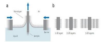 图2(a).LB沉积过程示意图;(b).多层单分子膜的制备