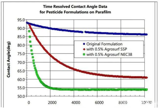 在农作物生长过程中,病、虫、草害种类繁多,适宜的喷洒农药可以保证农作物的健康成长。农药的防治效果直接与药液对植株上的润湿有关,不同植物表面的形态不一样,或亲水,或疏水。许多植物、害虫、杂草不易被水润湿,是因为该植物表面存在一层疏水的蜡层,需要在水中加入表面活性剂,以增加它们的亲水性。农药中加入表面活性剂,可以降低液体的表面张力,提高润湿分散性能,而润湿则离不开药液的动态表面张力、表面张力、药液在叶面上的接触角等。