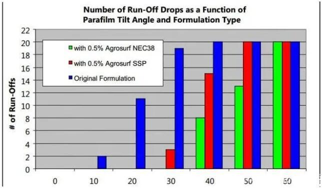 由于大部分植被树叶表面并不是水平的,当液滴滴落在叶片表面,且不能够快速润湿时,液滴由于重力的作用而滚落。滚动角和农药的沉积和稳定持留量相关,大的接触角、大的液滴体积和重量会导致液滴滚落,浪费农药。