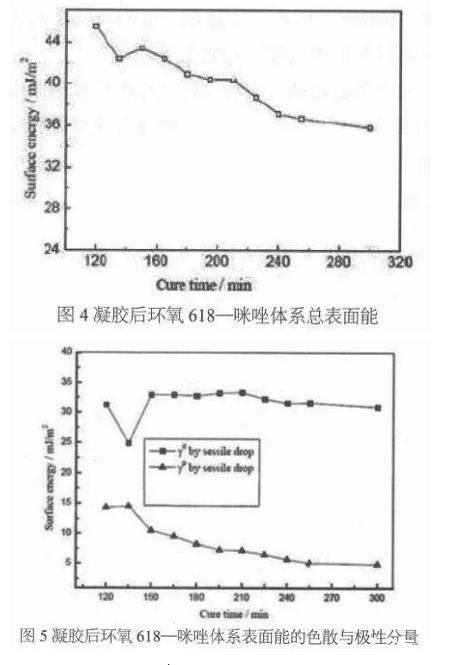 马全胜通过研究恒温固化过程中环氧树脂体系凝胶后表面能的的变化规律,结合固化机制和反应特性,分析环氧618-咪唑体系表面能的色散分量、极性分量的变化。