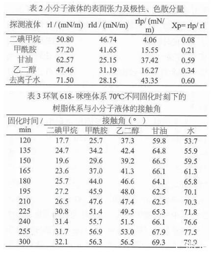 表2为实验所用小分子液体的表面张力及极性、色散分量,表3为环氧618-咪唑体系70℃不同固化时刻下的树脂体系与小分子液体的接触角。
