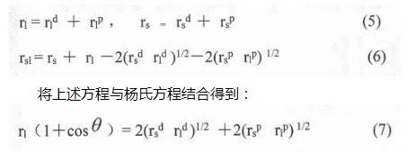 式中:rl、rld、rlp分别为液体表面张力、液体表面张力色散分量和极性分量;rs、rsd、rsp分别为固体表面能、固体表面能色散分量和极性分量;为液体与固体的接触角。