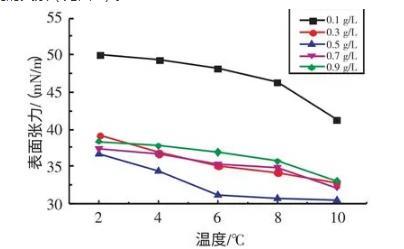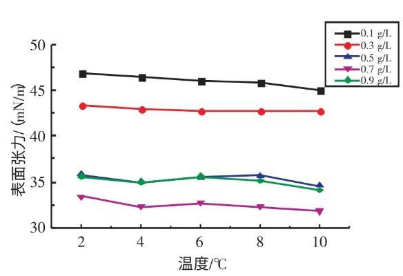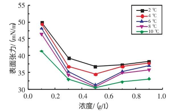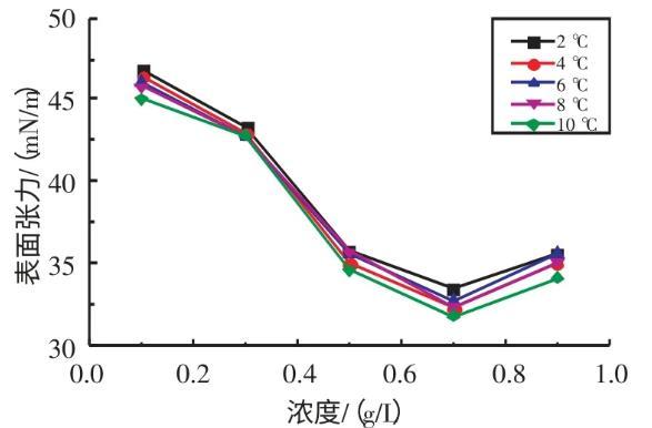 2.2.1不同温度下十二烷基苯磺酸钠溶液表面张力与浓度的关系实验研究了在温度为2、4、6、8、10℃条件下,SDBS溶液的表面张力与浓度的关系(见图3)。由图3可知,当浓度在0.1~0.7 g/L时,随着SDBS溶液浓度的升高,其表面张力逐渐减小;当浓度在0.7~0.9 g/L时,随着SDBS溶液浓度的升高,其表面张力逐渐增大。当SDBS溶液浓度为0.7 g/L时,其表面张力取得最小值。
