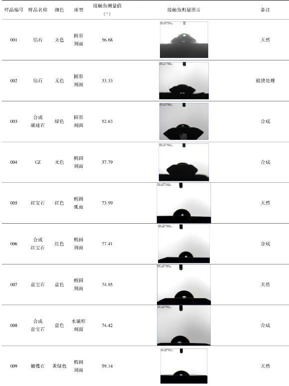 本文运用现代仪器(FTA200动态接触角测量仪)测量了15个天然和合成宝玉石品种(钻石、合成碳硅石、合成立方氧化锆、碧玺、托帕石、翡翠、琥珀等),以及经覆膜和充填2种处理方法的宝玉石样品(镀膜钻石、覆膜托帕石、覆膜翡翠、覆膜琥珀、充填碧玺)的表面接触角,并运用公式计算其表面张力。