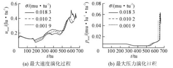 图2不同表面张力条件下空化泡溃灭过程中最大速度和最大压力演化过程