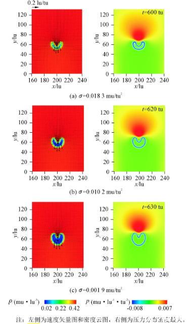 本节选取空化泡内外初始压差Δp=0.003 8、0.006 8、0.010 2 mu/(lu·tu2)三种压力,无量纲距离λ=1.6条件下,不同表面张力系数对空化泡溃灭过程中溃灭形态、流场、最大微射流速度和最大溃灭压力的影响。
