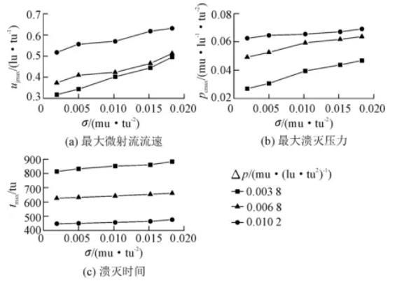 不同表面张力和初始空化泡内外压差条件下空化泡最大微射流流速、压力和溃灭时间变化规律如图3所示。随着初始内外压差增大,不同表面张力条件下空化泡溃灭产生的最大微射流流速、最大溃灭压力均随之增大,但溃灭时间则随之减小。初始空化泡内外压差为0.003 8 mu/(lu·tu2)时,当表面张力由0.001 9 mu/tu2增加到0.018 3 mu/tu2,最大微射流流速增加了55%,最大溃灭压力增加了74%。初始空化泡内外压差增加到0.010 2 mu/(lu·tu2)时,空化泡溃灭最大微射流流速仅增加了22%,溃灭压力仅增加了6%,最大微射流流速和最大溃灭压力增加幅度均随着空化泡初始内外压差的增加而减小,说明空化泡初始内外压差的增加会减小表面张力对溃灭过程的影响。