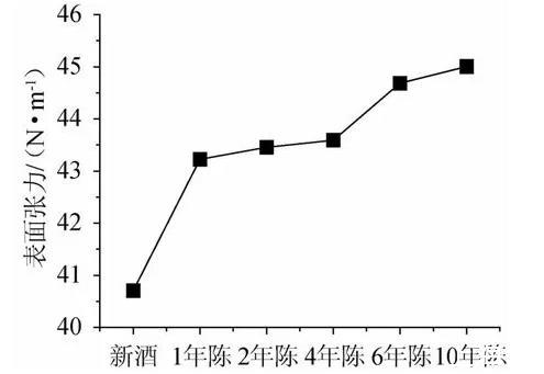 采用表面张力评价黄酒随陈酿时间的变化,结果表明,黄酒的表面张力随着陈酿时间整体呈上升趋势,黄酒的表面张力与陈酿时间具有显著的高度正相关关系。