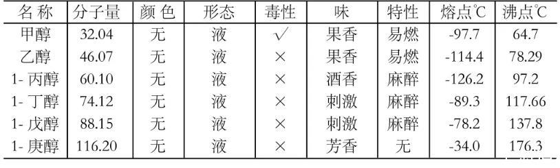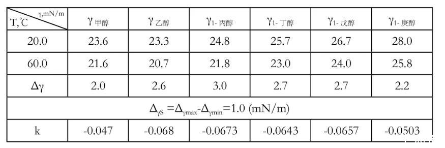 由于不同液态醇类的液态性质不同,其表面张力变化的程度如下表: