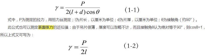 此公式也可以测定表面张力的近似值:由于吊片很薄,厚度可以忽略不计,而且接触角θ认为绝对等于90°,则cosθ=1,所以上式又可写为: