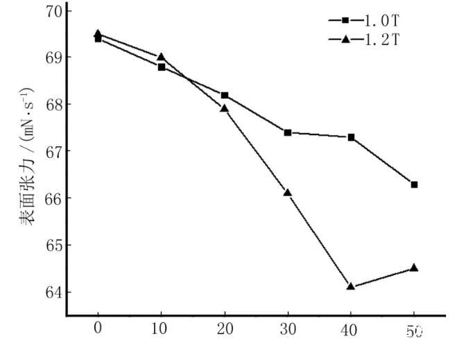 利用表面张力测试仪对不同处理时间的磁化水进行了测试,获得的磁化水表面张力测试数据如表1所示,图3给出了磁场强度为1.0 T和1.2 T时磁化水表面张力的变化曲线。