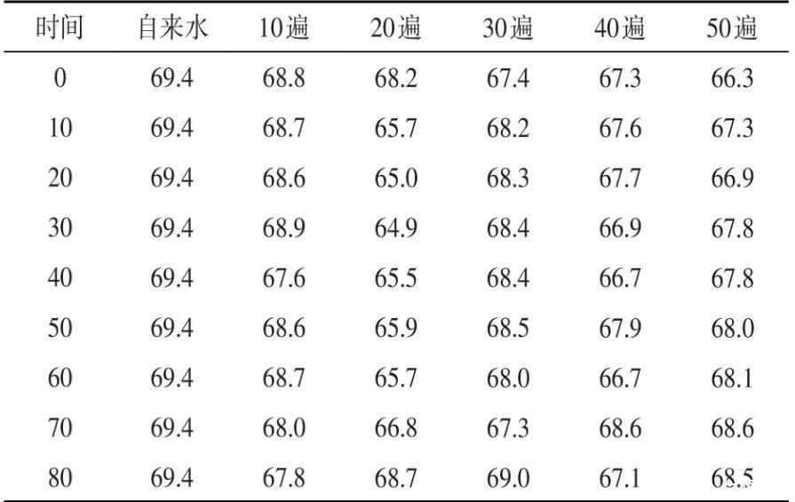 由图表分析可知,自来水经过不同遍数处理后,其表面张力值均有所下降。磁场强度为1.0 T时,下降幅度范围为1.0~3.0 mN·m-1。处理50遍时,水的表面张力减小的幅度约为3.1,相对于自来水的表面张力减小了4.5%;当水被处理30遍到40遍时,水的表面张力的下降速率出现明显减缓的趋势,水的表面张力仅仅减小了0.1 mN·m-1,相对于水被处理20遍到30遍时表面张力下降值的百分比为12.5%。