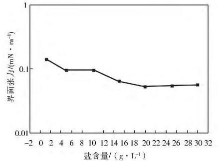 b.黏浓曲线体现出VES J良好的增黏特性,且在质量分数为0.02%时可使与W断块原油间油水界面张力降至10-2数量级;一定质量分数的无机盐对黏弹性表面活性剂VES J的黏度特性产生积极影响,且体系可在矿化度30g/L时达到10-2数量级的界面张力,体现了复配体系良好的耐盐特性;90℃较25℃黏度保留率达到74.6%,W地层温度(65℃)有利于发挥体系降低油水界面张力能力。