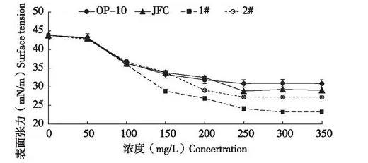 农药制剂喷雾使用时,药液的表面张力会影响到药液在植物叶片上的润湿性能和持留量,很多药液难以在水稻、小麦和甘蓝叶面湿润展布,是由于药液的表面张力大于这些植物的临界表面张力,因此要选用能显著降低表面张力的表面活性剂,或增加表面活性剂的用量,使药剂推荐剂量药液的表面张力值小于水稻的临界表面张力值,才能有利于药液在水稻等叶面上的湿润。本研究中发现,2.3%甲维盐微乳剂在推荐使用倍数下,对应药液表面张力43.8 mN/m明显高于水稻的临界表面张力36-38 mN/cm,表现为药液在叶片上难润湿展布,因此本文通过添加4种助剂来降低药液表面张力,当药液表面张力低于靶标作物叶面表面张力时,药液才能在叶面润湿展布,提高喷雾药液的持留量和铺展面积,综合考虑,4种助剂表现最优是乳化剂1#,其次是乳化剂2#,然后是JFC,OP-10表现最差。