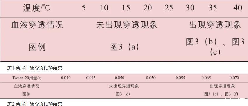 温度和Tween-20用量对合成血液穿透试验的影响