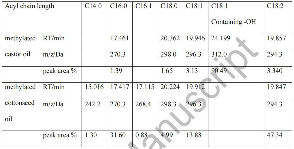 表1 甲基化蓖麻油和棉籽油中的物质及含量