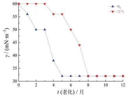 将纳米涂层放置在室温条件下自然老化12个月,每隔一个月测试一次表面张力。由图2可知,老化前涂层的表面张力均为60 mN/m,其中,空气条件下等离子处理的涂层的表面张力在前3个月内无变化,4个月后降为56 mN/m且保持了1个月左右,6个月后降为50 mN/m,7个月后降为45 mN/m,8个月后降幅最大,降至仅有32 mN/m,之后的4个月基本保持在这一水平。对于以氮气为气源等离子处理的涂层,其表面张力在1个月后降为56 mN/m,2个月后降为50 mN/m且保持了1个月左右,4个月后降幅最大,降至38 mN/m,5个月后再降至32 mN/m,之后的7个月基本保持在这一水平。纳米涂层以空气等离子处理后的表面张力在前8个月的下降幅度明显小于氮气等离子处理的涂层。根据行业经验,涂层要满足粘接性能的话,其表面张力一般需要≥34 mN/m,≥38 mN/m则几乎可以满足所有粘接需求。以空气作为气源等离子处理后的7个月内涂层的表面张力仍大于40 mN/m,因此可以满足实际应用需求,而且优于以氮气作为气源的处理效果。