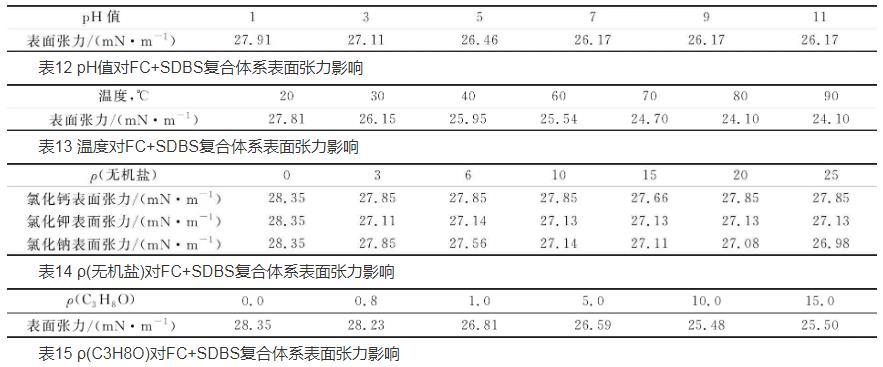 依据实验Hz实验结果,按照SDBS的0.395 6 g/L与0.056 0 g/L的FC复配,分别测试pH值、温度、无机盐和溶剂对复配体系表面张力的影响,结果见表12~15。