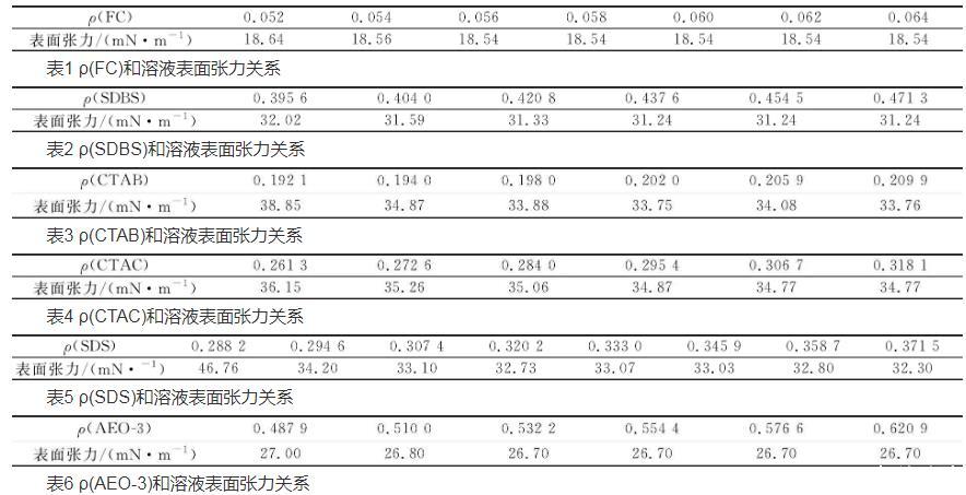 由表1~6可见,不同表面活性剂的临界胶束浓度为:FC为0.056 0 g/L,AEO-3为0.532 2 g/L,SDBS为0.437 6 g/L,CTAB为0.202 0 g/L,CTAC为0.306 7 g/L,SDS为0.320 2 g/L,CMC由小到大顺序为:FC