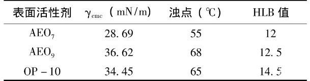 表面活性剂:脂肪醇聚氧乙烯醚AEO7(碳原子12,乙氧基数即EO数7),海安石油化工厂产品;脂肪醇聚氧乙烯醚AEO9(碳原子12,乙氧基数即EO数9)海安石油化工厂产品;辛基酚聚氧乙烯醚(OP-10,碳原子8,EO数10),广州乐恒化工有限公司产品;去离子水。
