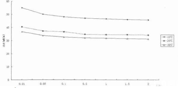 测量不同温度下OP-10在质量分数浓度为0.1%的动态表面张力dst,分析温度对dst的影响。